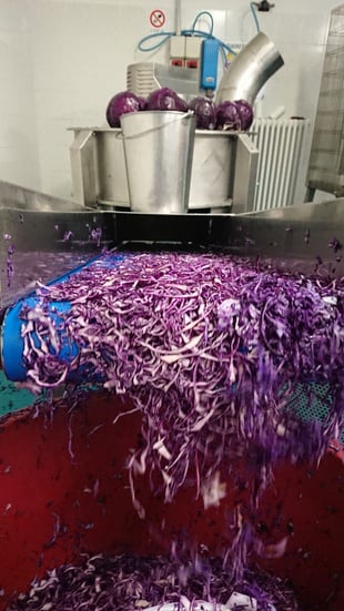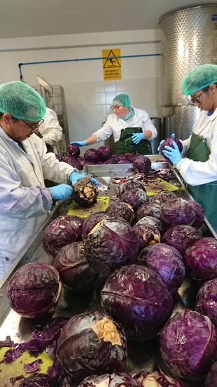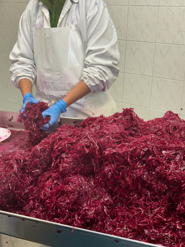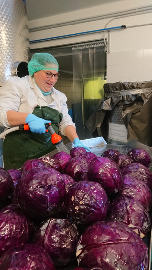 Selezioniamo con cura i migliori cavoli cappucci rossi. Li sfogliamo, li laviamo e li affettiamo con attenzione prima di salarli e metterli a fermentare all'interno delle nostre botti per almeno 40 giorni. Durante questo periodo di fermentazione, i cavoli si trasformano gradualmente in succulenti crauti, mantenendo intatto il loro autentico sapore e assumendo la caratteristica tonalità rossastra.